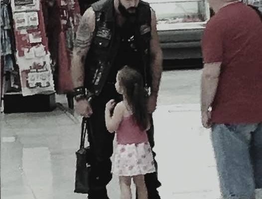 All because one six-year-old girl recognized that the scariest-looking person in Walmart might just be the safest person she could run to.