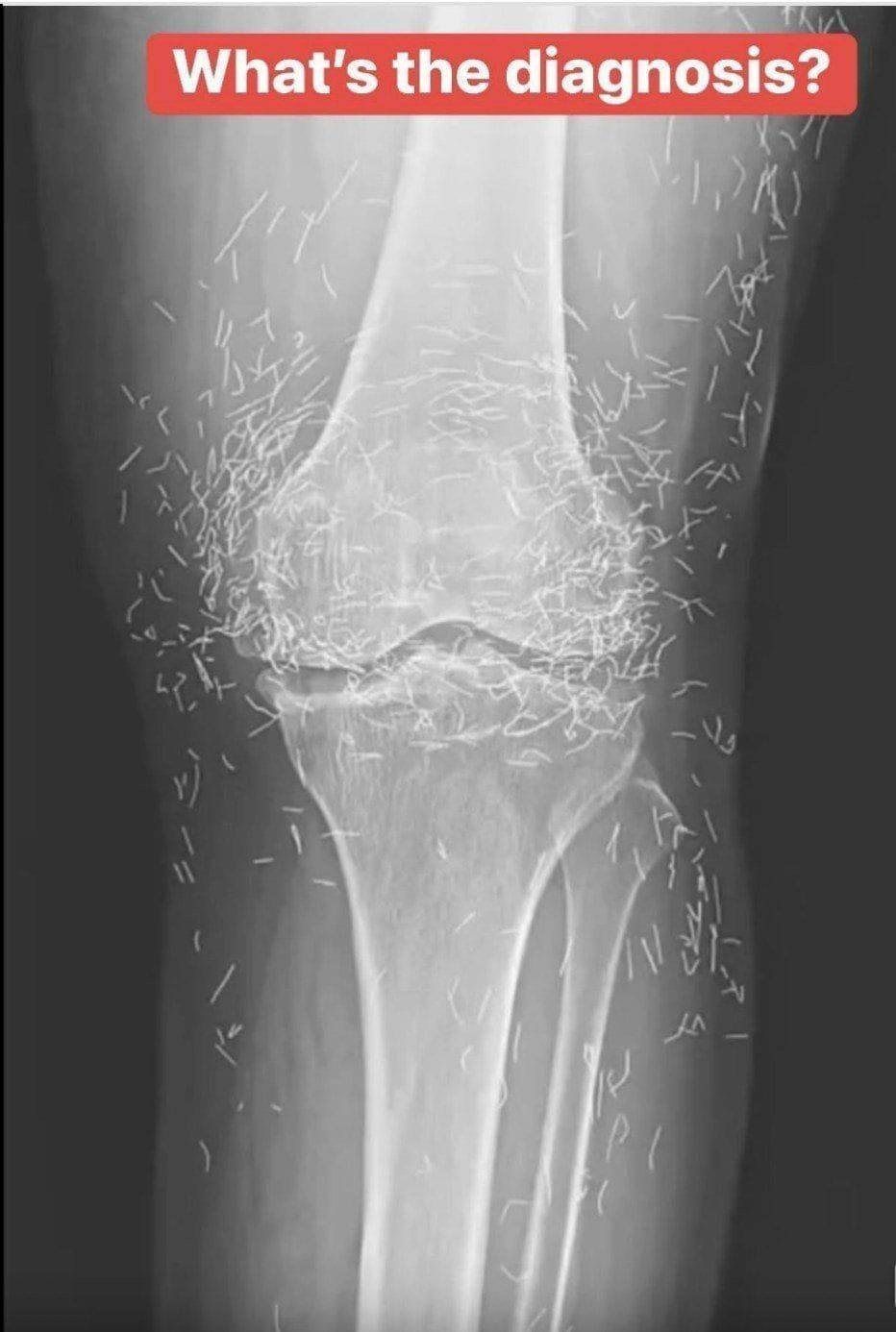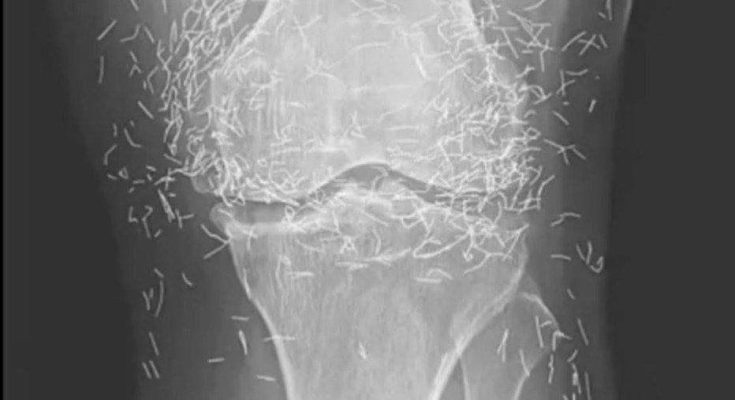 Years later, when doctors took X-rays to evaluate her knee condition, they weren’t prepared for what appeared on the images. Her knees were filled with dozens of bright, metallic flecks — tiny needles embedded deep within the joint area.
